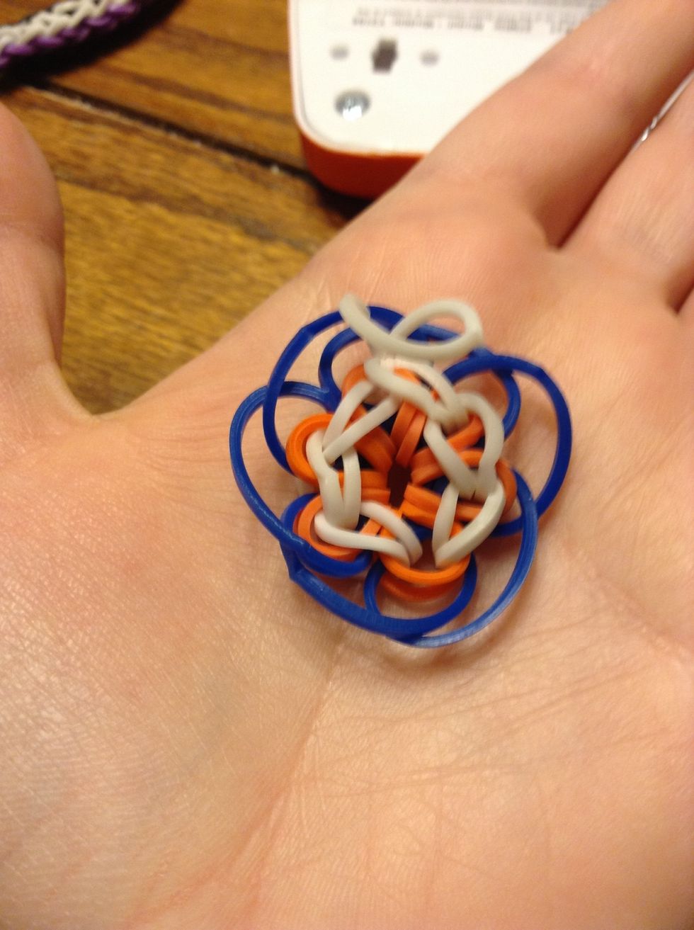 Push the hook through the two blue petals it's by and put the other end of the white band back on the hook.