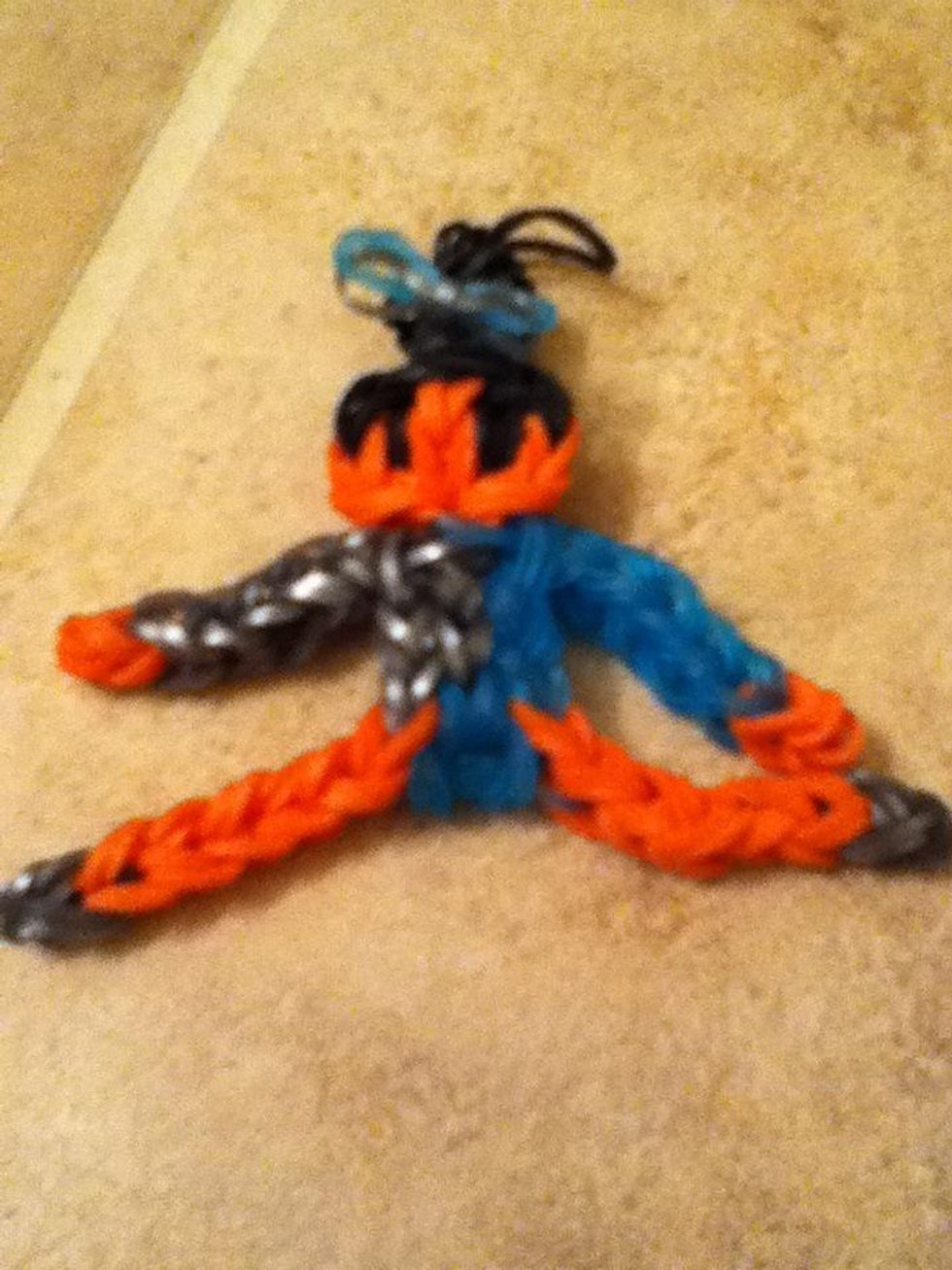 Rainbow loom in square set position Neon orange bands Black bands 2 colors for the leotard Color for the hair Hook