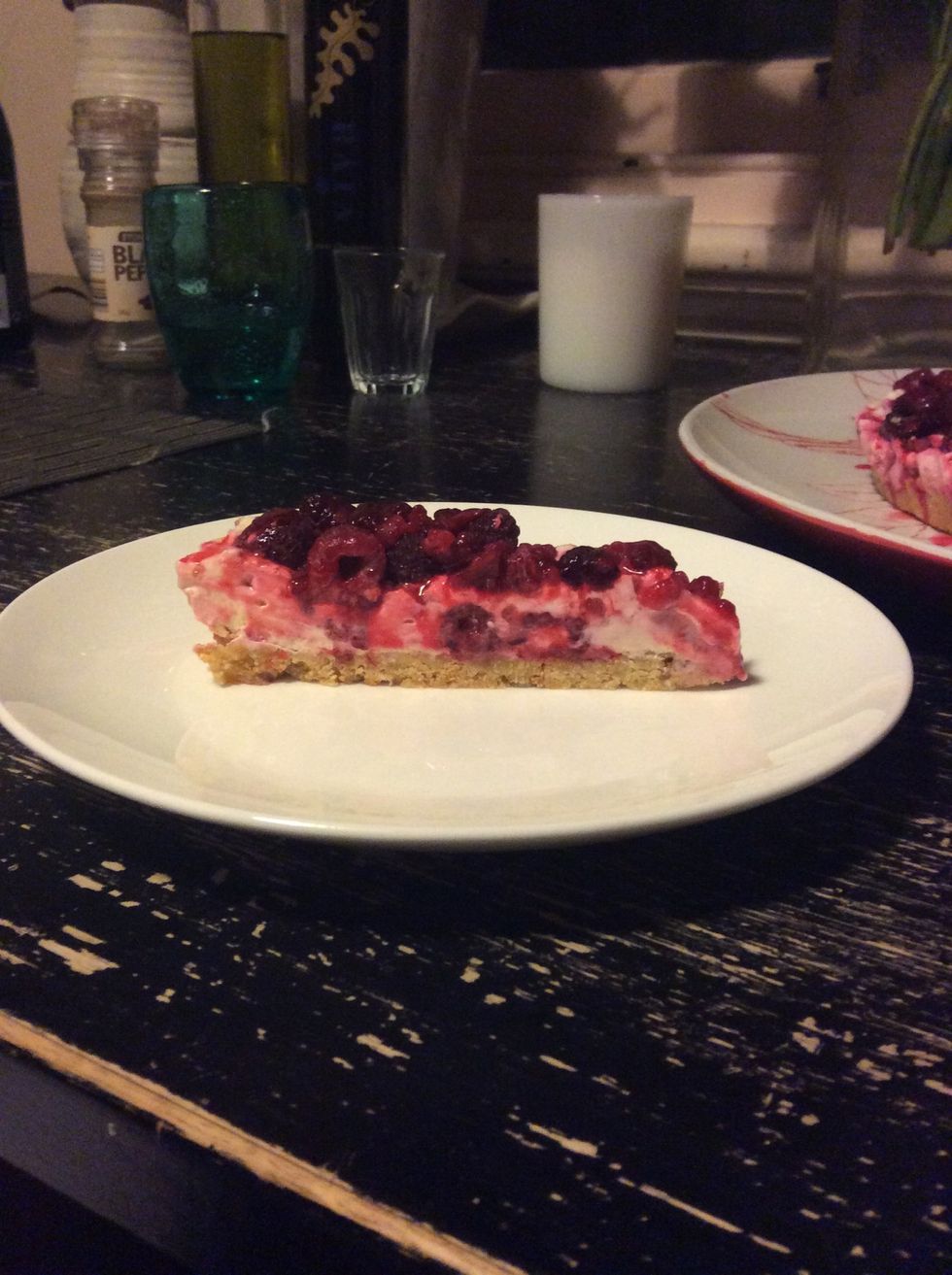Take the tray out of the fridge and spoon the mixture on to the pasta then top with the remaining raspberries