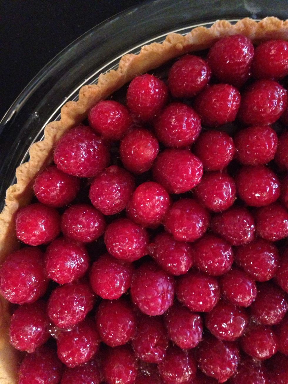 Take out and arrange your raspberries on z Top. But if you want to go further, Then you will have to glaze it. Tart will shine and raspberries will stay in place when u cut z tart