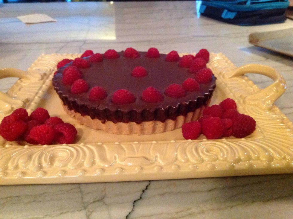 Shell:1/2c Flour2/3c Corn starch 2/3c Powdered sugar2.0 Sticks of cold butter2.0tsp Vanilla Topping: 8.0oz Whipping cream6.0Tbsp Butter 1/4c Chocolate chips 2.0oz Unsweetened chocolate chips1.0tsp Vanilla Raspberries