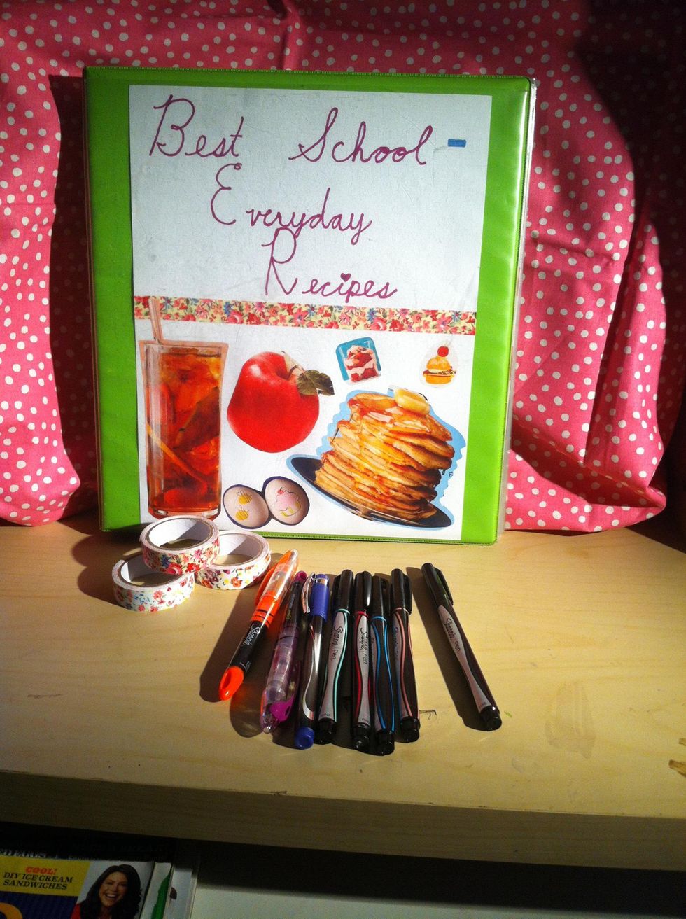 Finally for the cover! BE CREATIVE. I just prefer mine to be simple. I used regular printer paper for the background, fabric tape, and I cut out food pics I liked from the magazines š