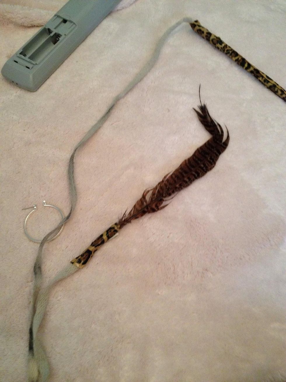 Tape 2 pencils together. (1 is ok) Be sure they're unsharpened. Sticks work if you don't want to use pencils!Take a shoelace out if an old shoe.Little Prim is already playing with her toy....Tape the shoelace to the pencils.Tape the feather....