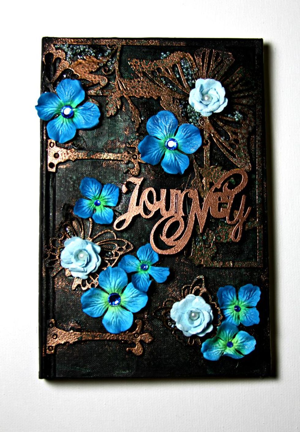 Using the Art Anthology Orbital Stencil and Black Leather Sorbet ad texture to your book cover. allow to dry and adhere your chosen chipboard pieces to your book cover and paint with Gesso.