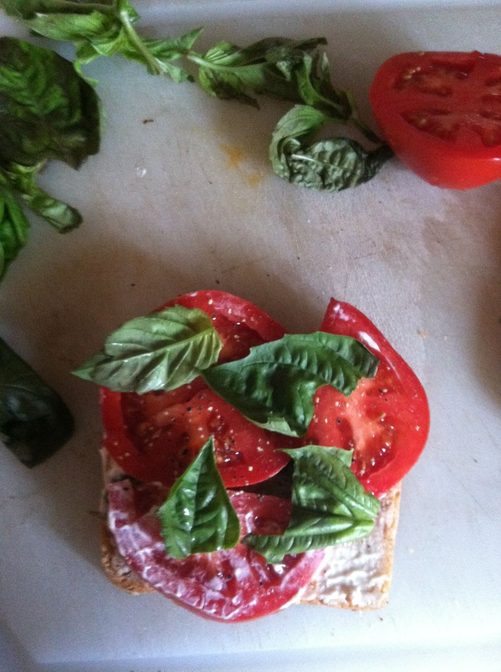 Tear up basil into little pieces and put on the toast