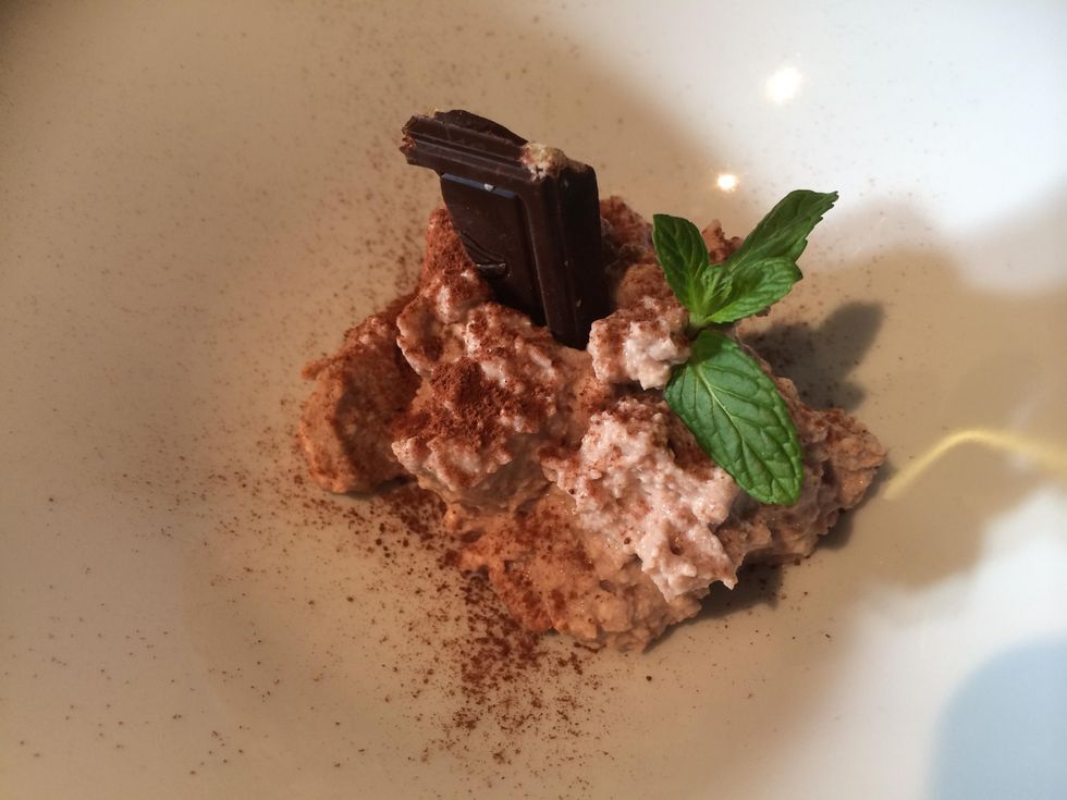 Mix the ricotta with the sugar the cocao podwer the vanilla essence,until the cream is done. with a piping bag create a swirl on a plate. Serve with a sprinkle of cocoa powder and some chocolate chips