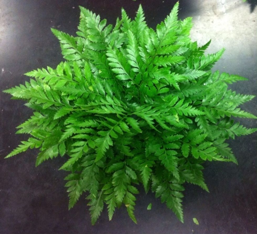 finished greening. it should be round all around. you should do a "brush" test smooth your hands all over the arrangement none of the greens should come out if pushed in fully. top view