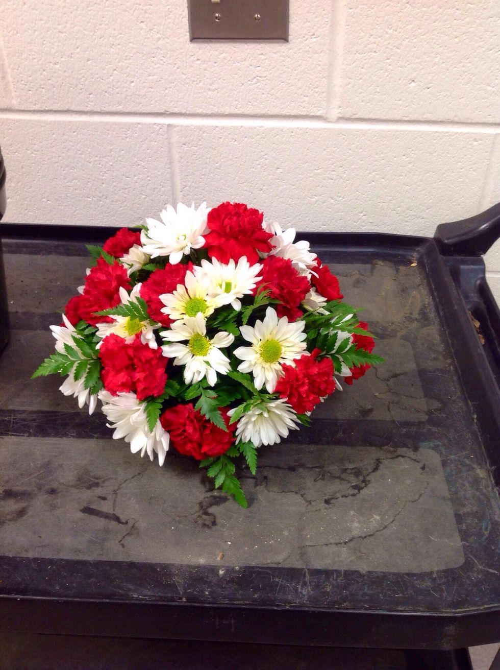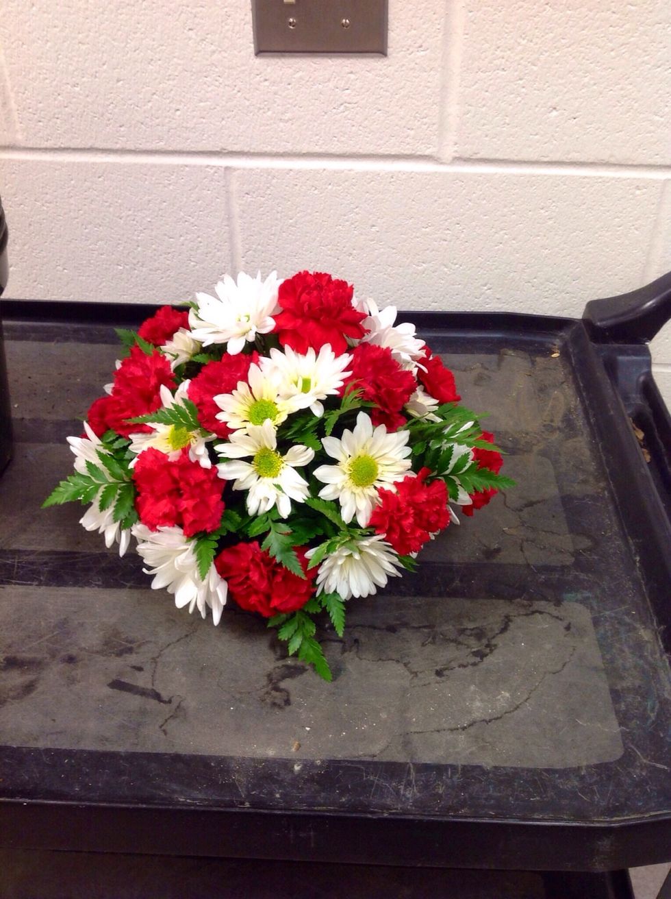 After putting the 6 carnations on the arrangement you must fill the rest if the blank space in with mums and and more carnations. In the end, your round mound should actually look like a "round mound"