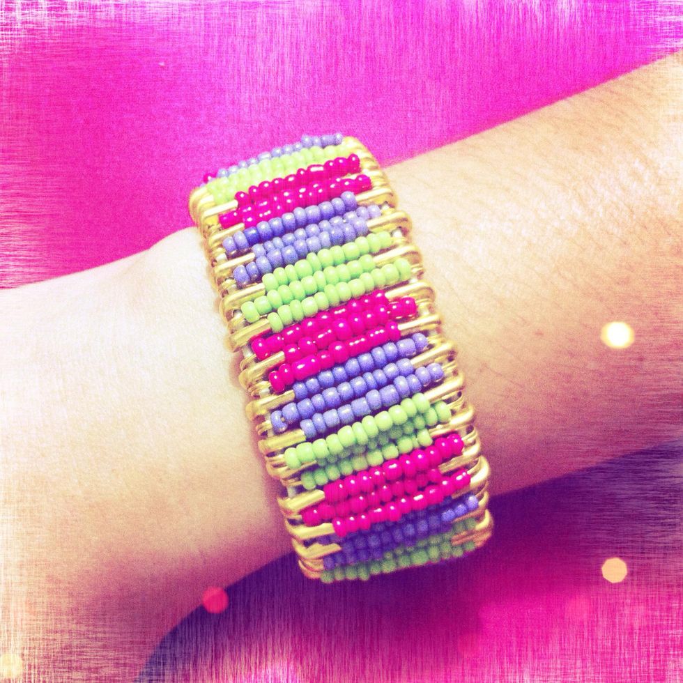 3. Repeat step 2 until you have enough safety pins beaded (the amount of pins will depend on your wrist size).
