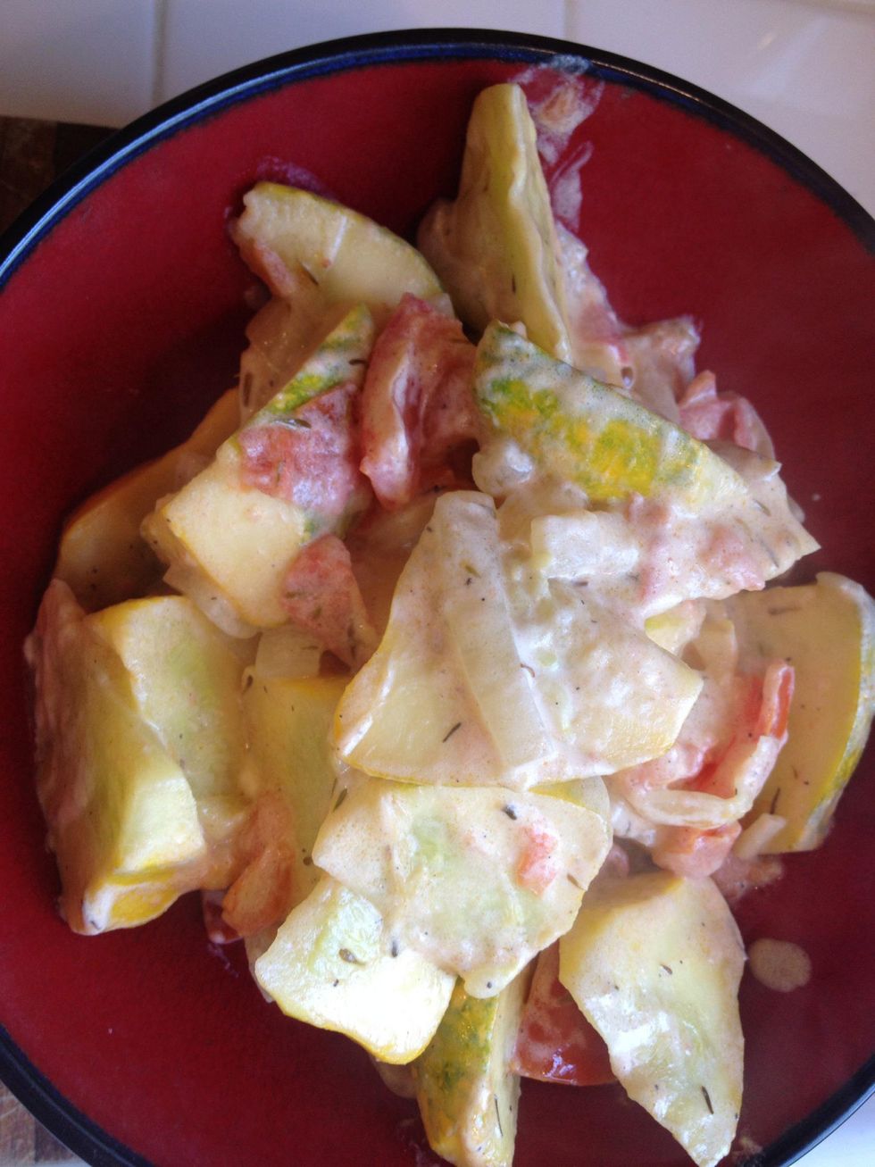 I used these darling party pan squash from the Farmers Market, but you may use your favorite summer squash. Zucchini or Crookneck would do just fine.