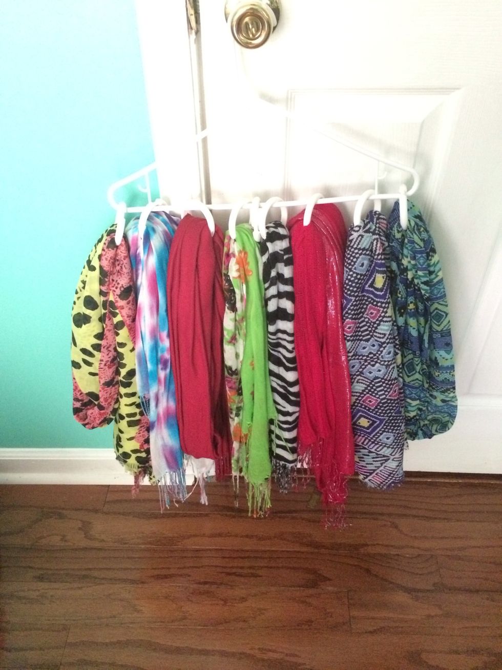 Hook the shower rings to the hanger. If you have a hanger the same as mine put one shower ring on each side with the bars so the scarf with be balanced.