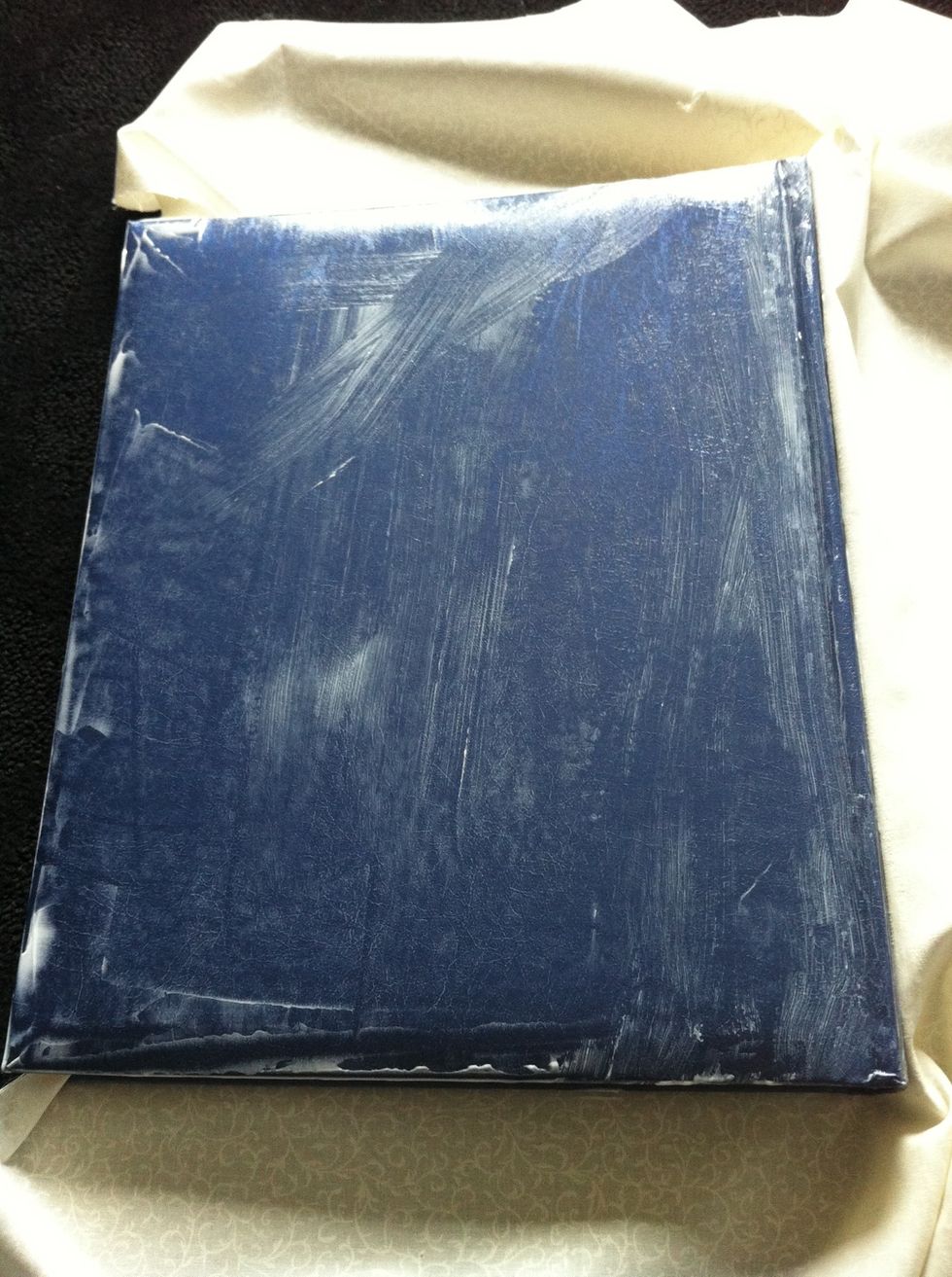 Smooth out from the centre out and fold the excess material under the book cover, repeat for the spine and back cover of book