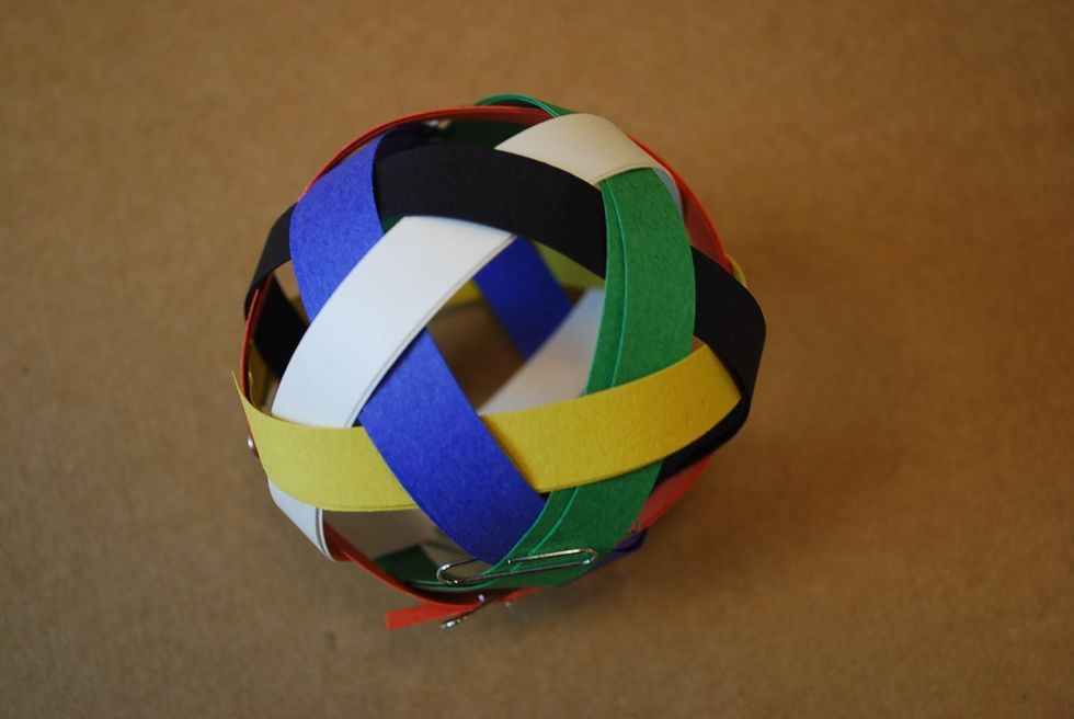 Before coiling the yellow strip, weave it over the white loop, under the blue loop, and over the green loop. Then coil it to the same size as the orange loop.