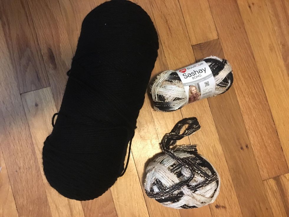 Start by measuring out 5 6ft pieces of black yarn and 1 6ft piece of sequin yarn.