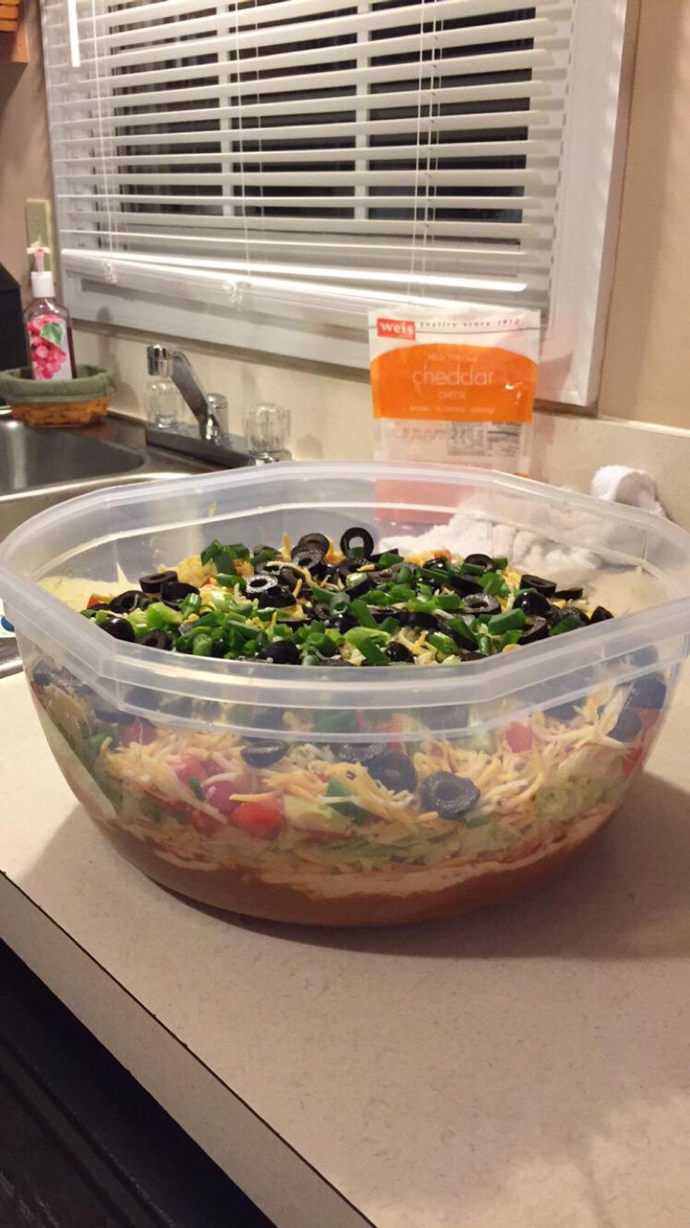 Then add your sliced scallions and you've completed your taco dip! Serve with chips and enjoy.