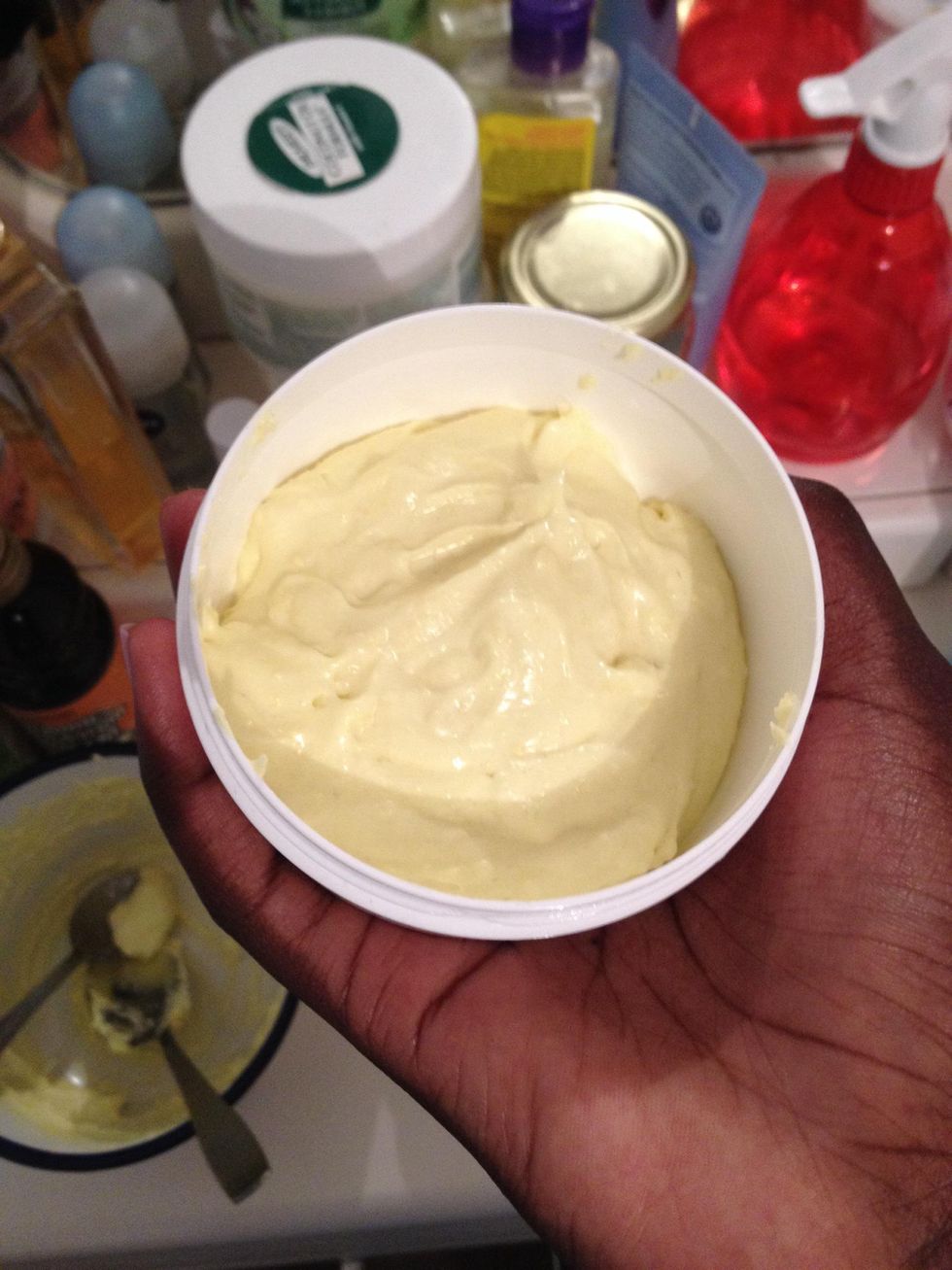 Add about 4 tablespoons of 100% African Shea butter. It is very important to get unrefined and pure Shea butter because it has many benefits to it. Like its packed with vitamin A.