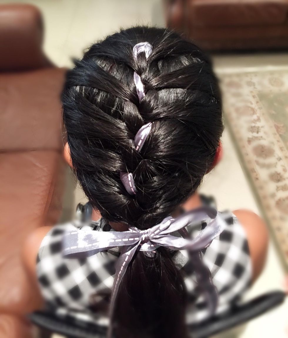 Divide the hair tied by the ribbon into three equal sections. Bring the ends of the ribbon down into your left and right sections, keep your ribbon there throughout the process.