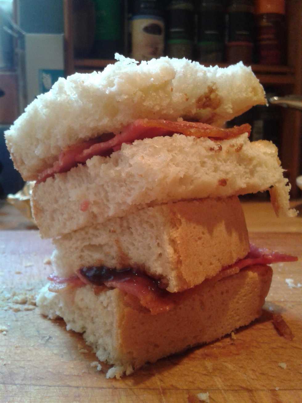 Pop the lids on, give a gentle squeeze and repeat with the rest of the bread and bacon. Serves 4. I had to cut my slices very thick because I had just baked it. Thin slices work just as well.