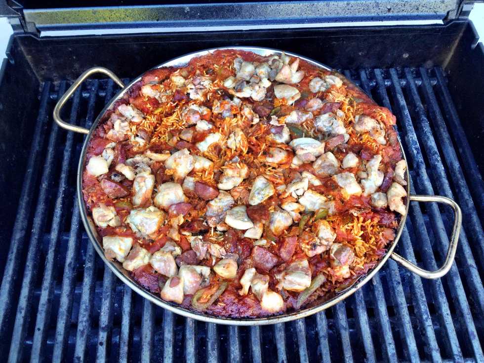 Paella gets its name from the pan that it is cooked in, also called a paella. Throw that bad boy on your grill. You *did* preheat the grill, right?