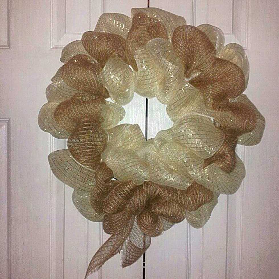 Make two more poofs and secure. Make two last poofs and secure. Cut from roll. Fluff out your mesh on wreath and fluff out bow. You're done!