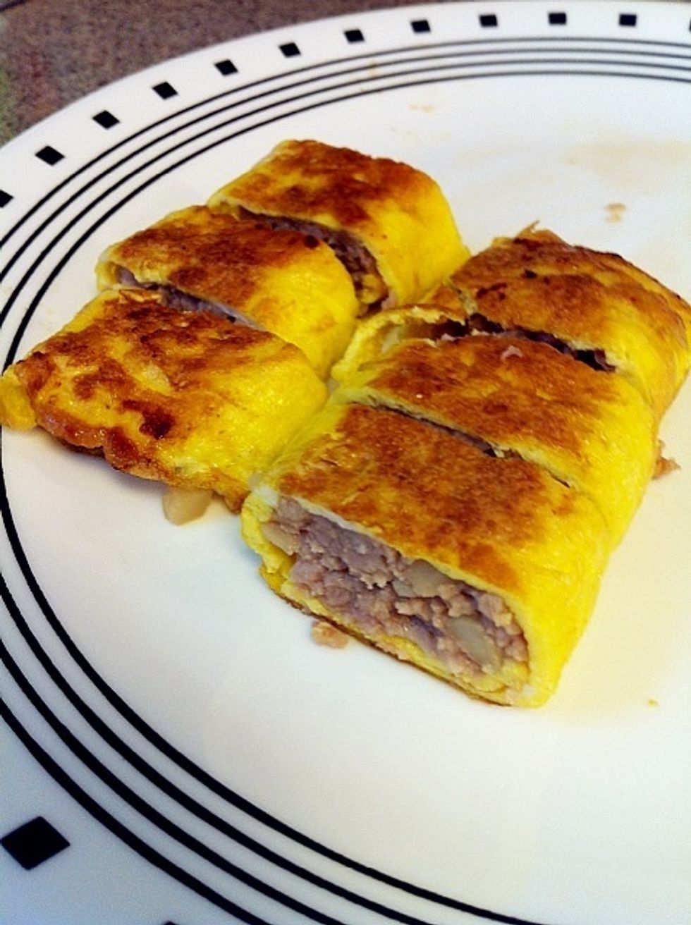 Put the half cooked eggs on a plate and add the ground pork as picture. Then, roll it carefully.