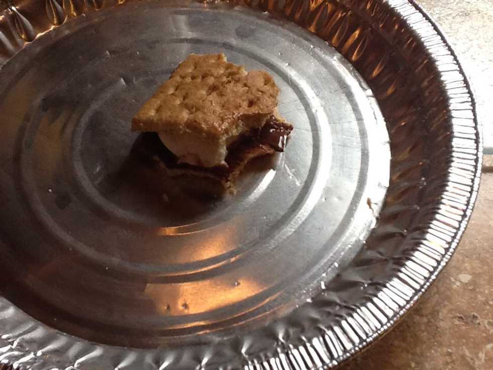 The finished product after "sampling." The chocolate bar was softened as was the marshmallow. Grandkids thought they were great!