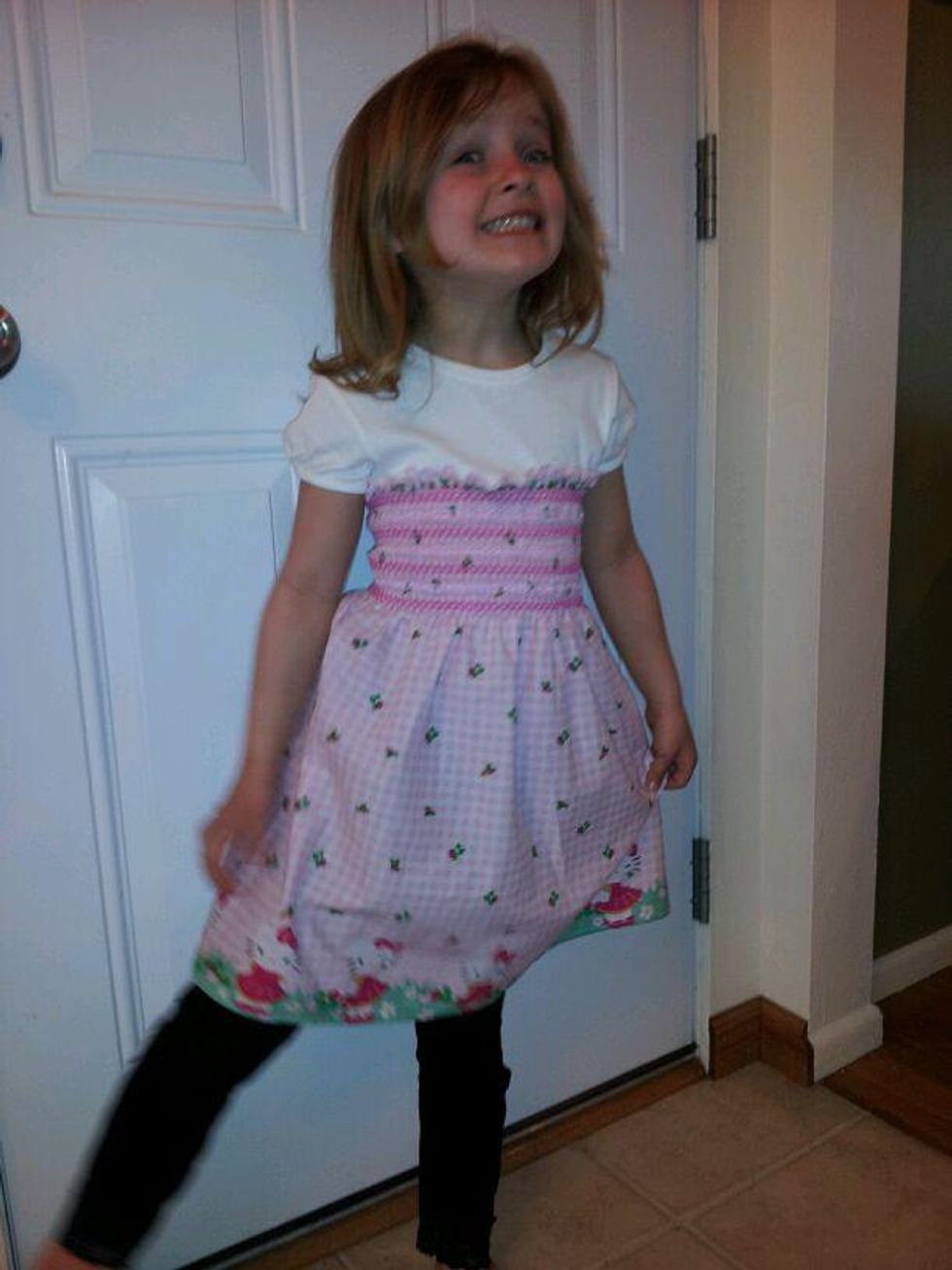 Easy and quick dress with the already shirred fabric available at Walmart and joanns. Visit my blog www.ImpatientlyCrafty.com for more tutorials.
