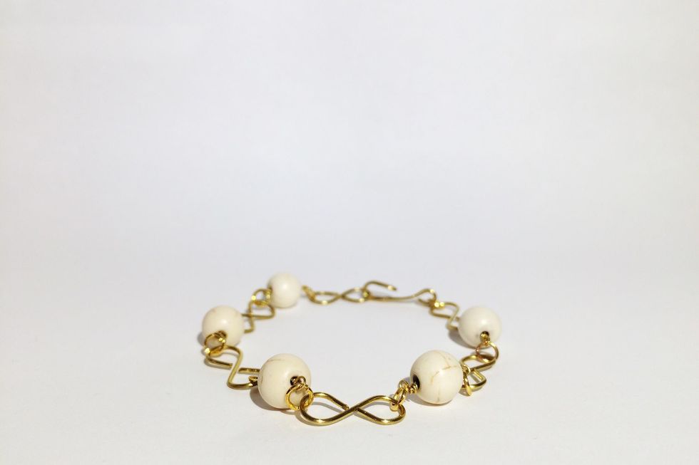 Close the jump ring in the same way and start putting all of the components together, connecting the wrapped beads with the infinity links using jump rings.