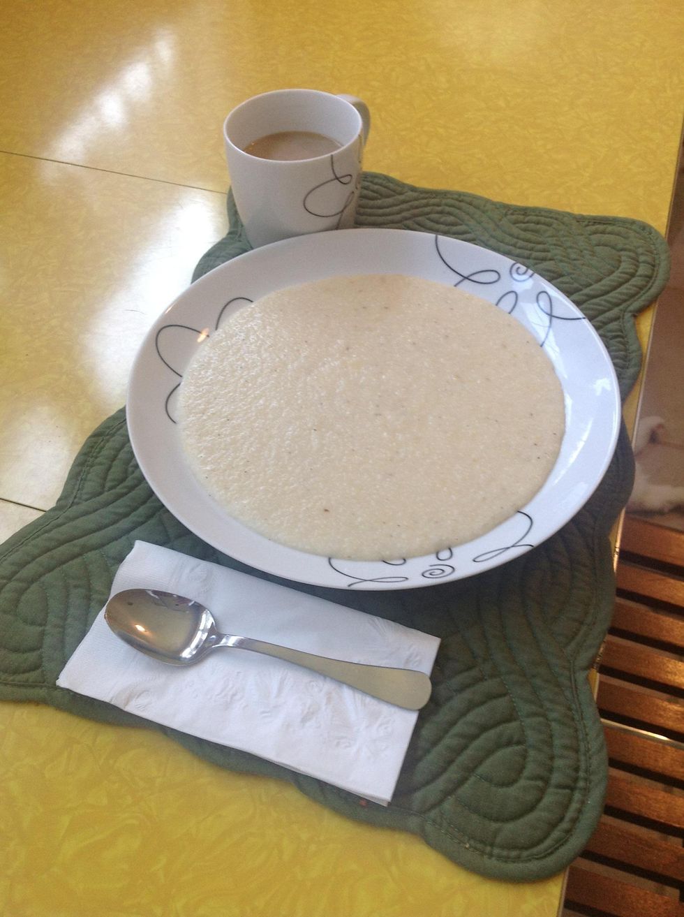 A cup of coffee and a large plate of grits makes a great breakfast.