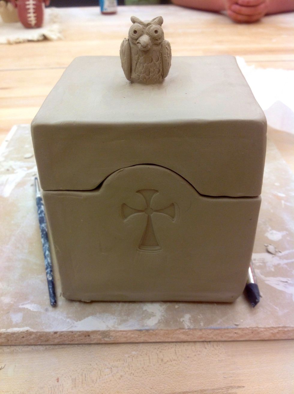 Take the last A pieces and slip and score the sides. Slip and score the edges of the box where the A piece will attach.