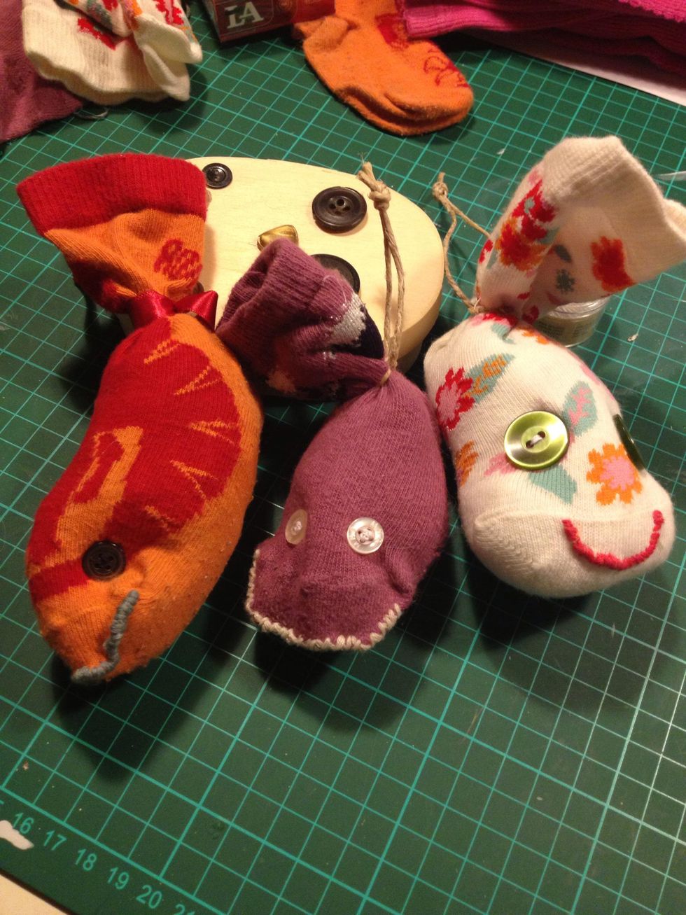 Found a basked of mismatched baby socks when tiding up in the attic. I was going to throw them out, but then I thought that they might still have some purpose left in them.