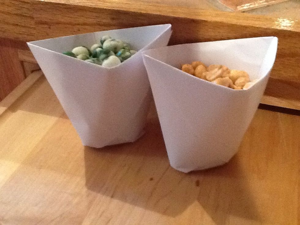Heres what mine turned out like. I filled them with wasabi peas and peanuts.