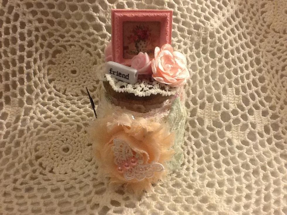This is what I added on top of my spool. I added a small resin frame from Michaels, the fabric flower is from FlairByMe as well as the foam rosebud.