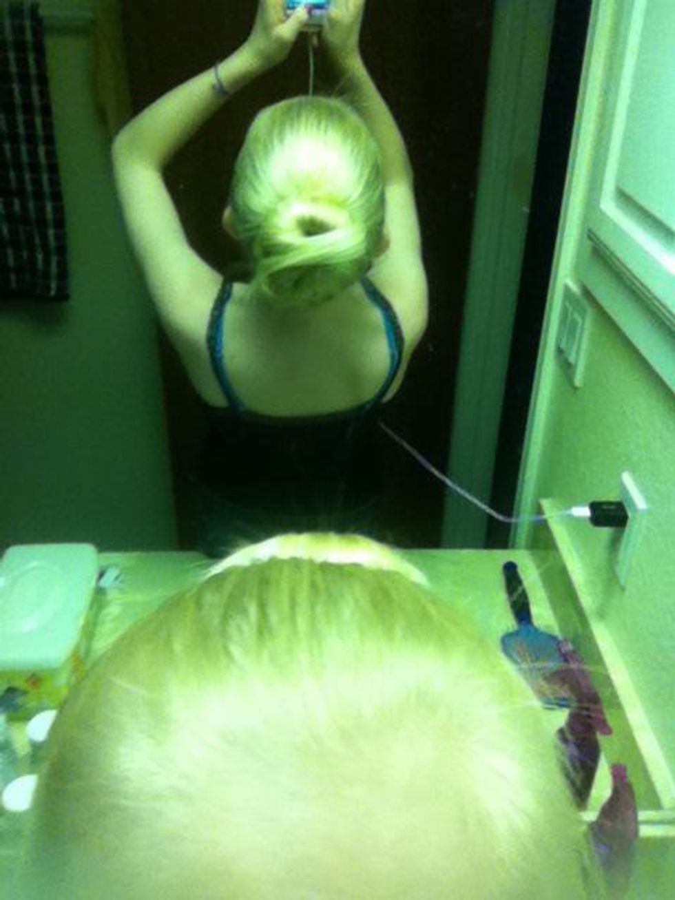 Brush hair Put hair into ponytail Grab rolled up sock Put sock into hair. Sorry for the blur Spread hair around sock. Put hair band around sock to hold in place Split into 2 parts Twist around sock and secure with bobby pins