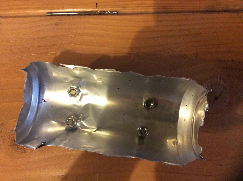 Cut the soda can in halfDrill four holes in canInsert four bolts into the holes that have been drilledAdd the nuts to saucer bolts in placeThen bend a thin metal to make the greats and then place it on top