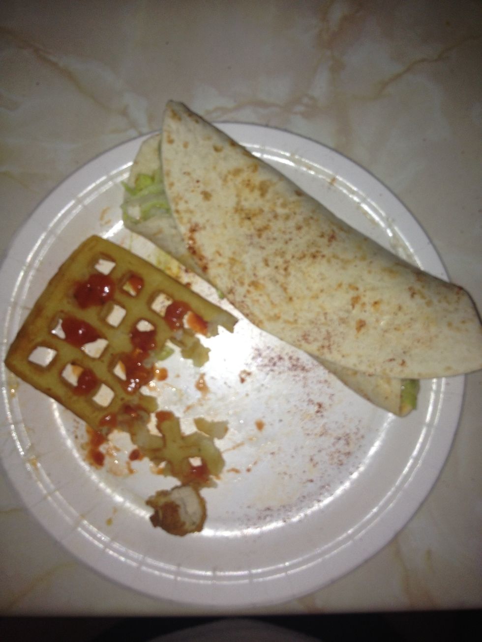 Really spicy chicken wrap for anyone who loves a simple spicy snack :) you can make your own side with this, but I just choose waffle!