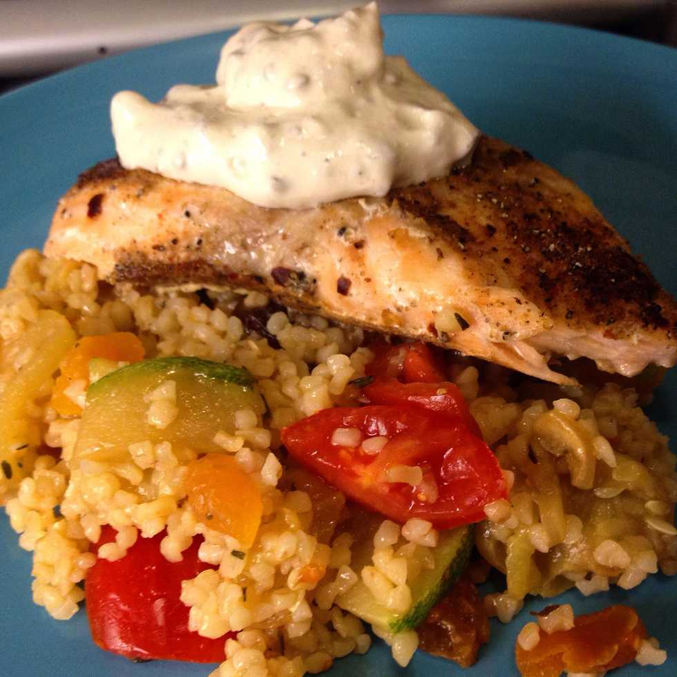 Serve the bulgur with the salmon and the tapenade yogurt.