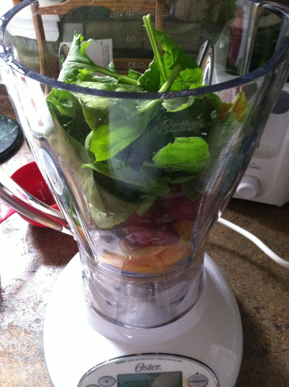 Put in the yummy greens: 1 cup of spinach and kale! (Don't worry, you can't taste it.)