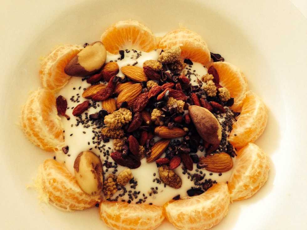 Pour in about 200 grams yoghurt (or as much as you want to eat). Sprinkle over Chia seeds and a palm full of almonds.