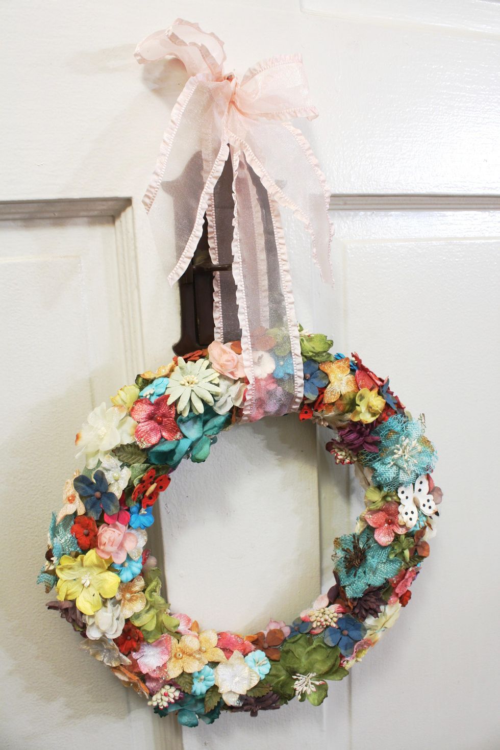 I hung with just a simple sheer ribbon so all the glorious flowers show through