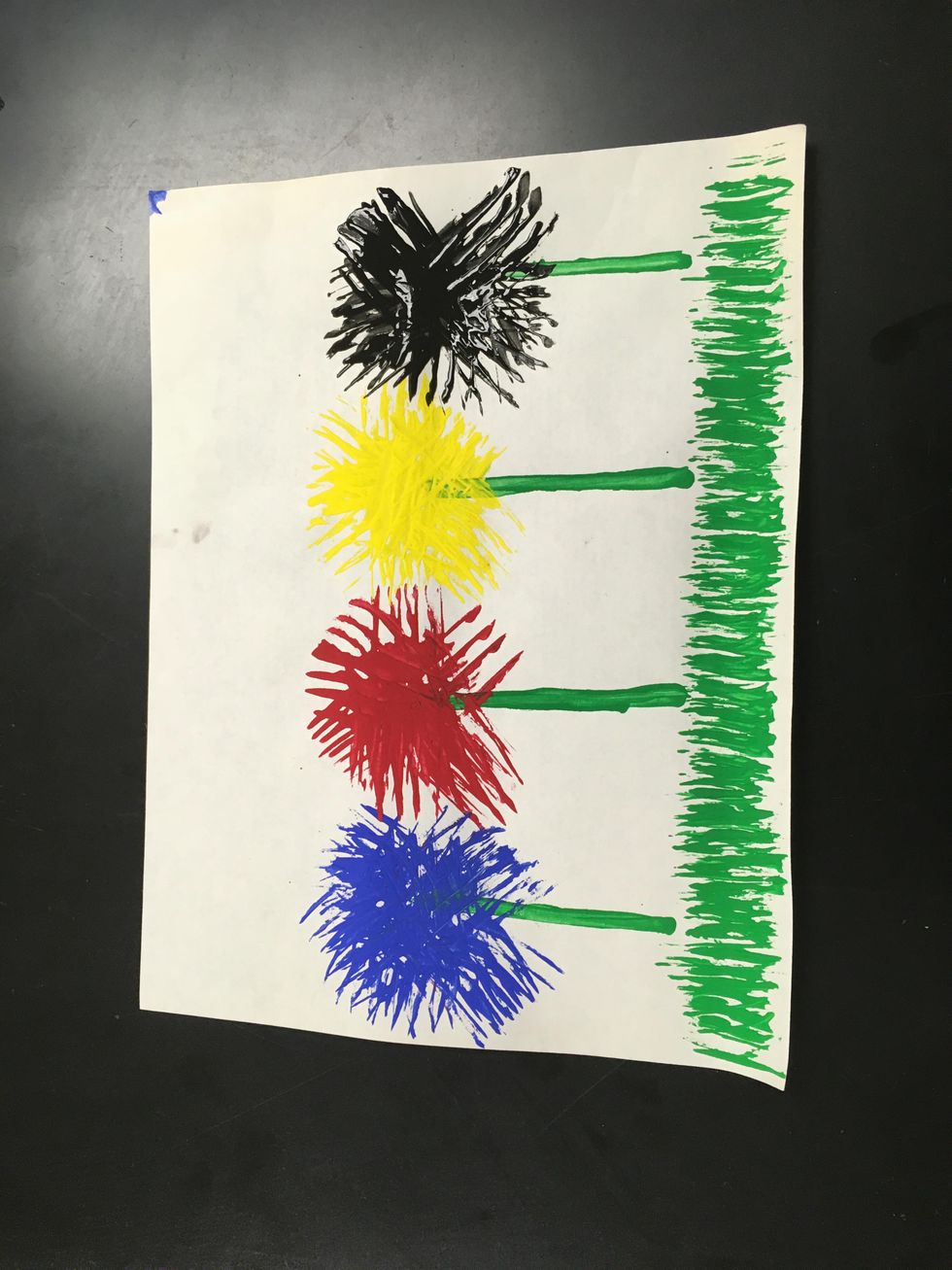 Now to the flower. Take another fork with the color paint desired and press it on the paper at the top of the stem as seen.
