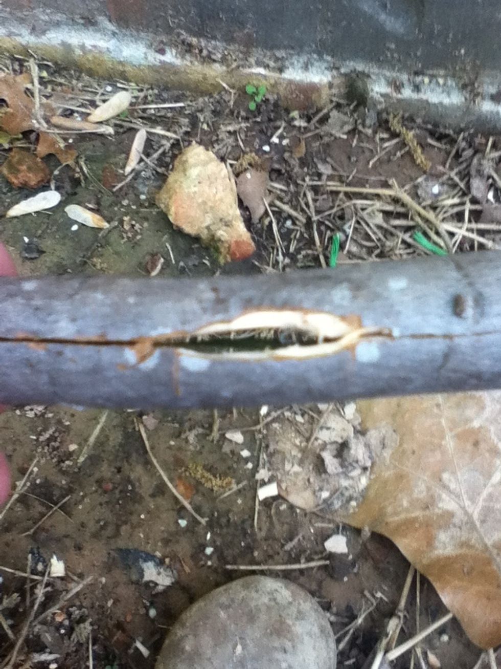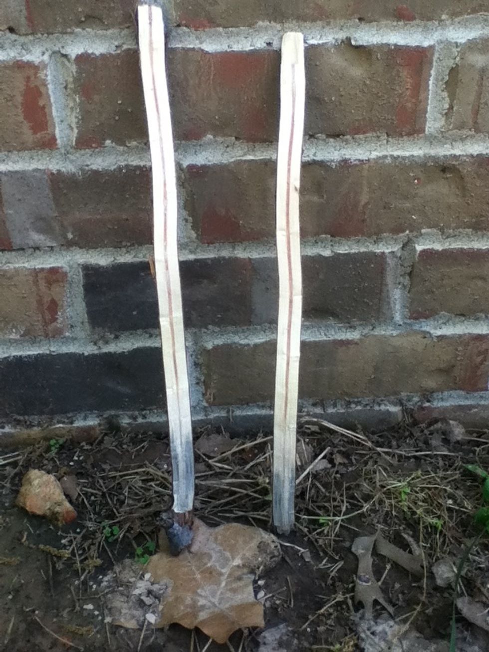 Take the pocket knife and cut the stick in half.Use the rock and hit one and of the pocketknife.