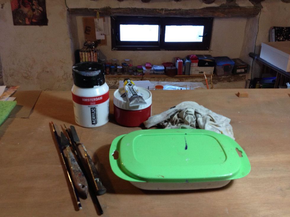 Mix up your colours on your normal palette (I use an old sheet of glass) and scoop them into the stay-wet container with a palette knife.