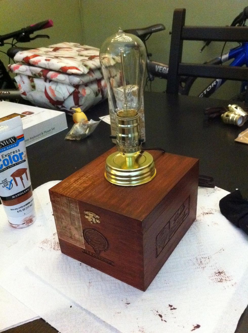 Put together your lamp kit via the instructions that came with it. Once you have the base together, simply glue it to the center top of the cigar box (once the stain is dry!). I used a hot glue gun.