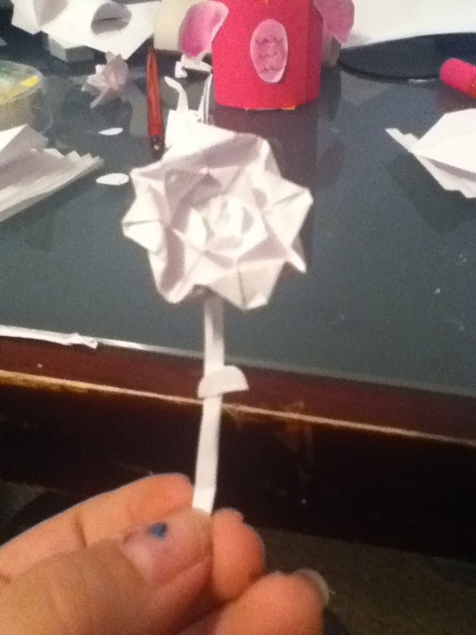 If you noticed, I twisted the top. You will put that through the hole in the flower, put glue on it, and fold down till it sticks