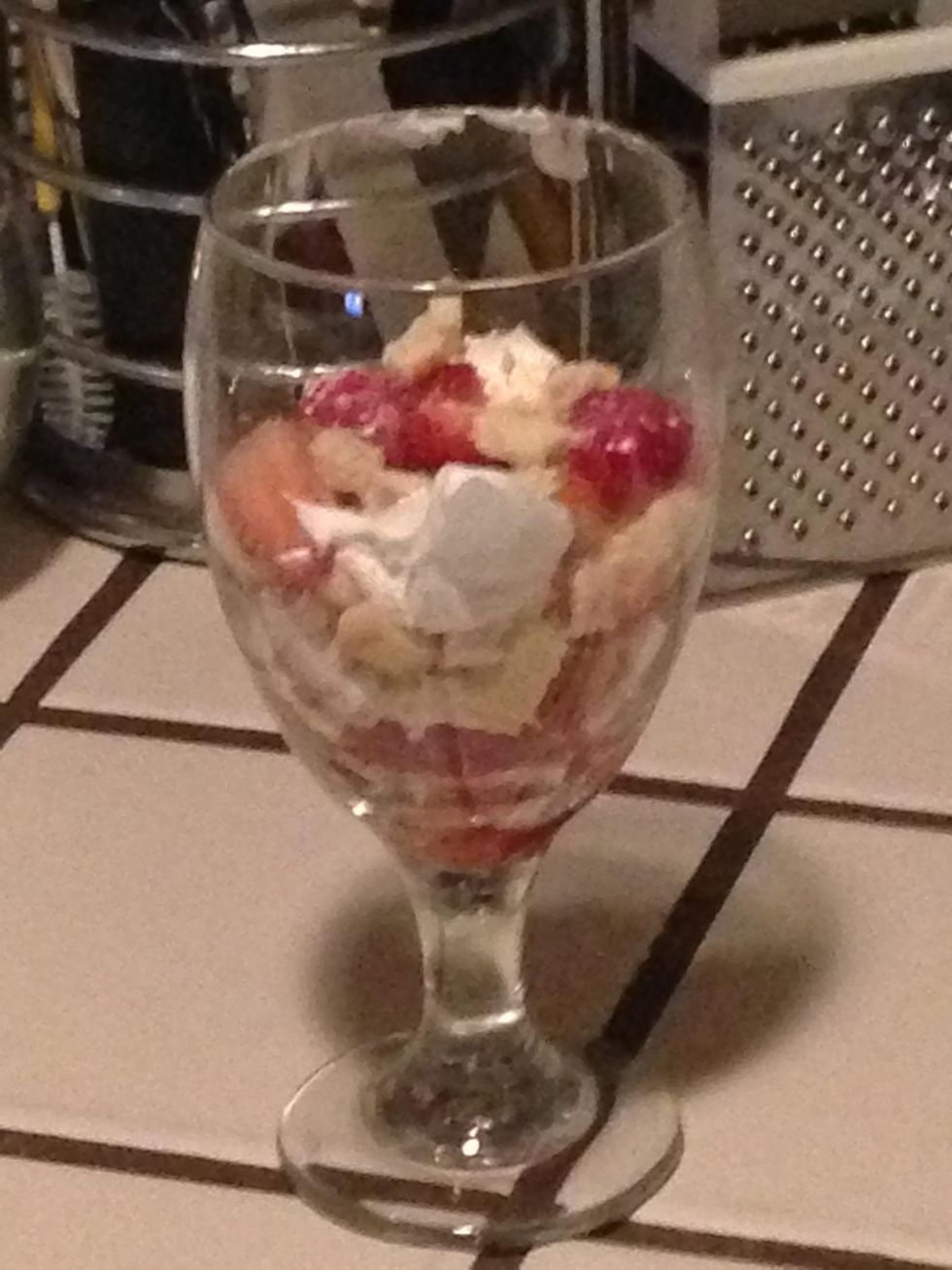 Okay your strawberries should have a nice glazed look now crumble the shortbread cookies and have the glass ready