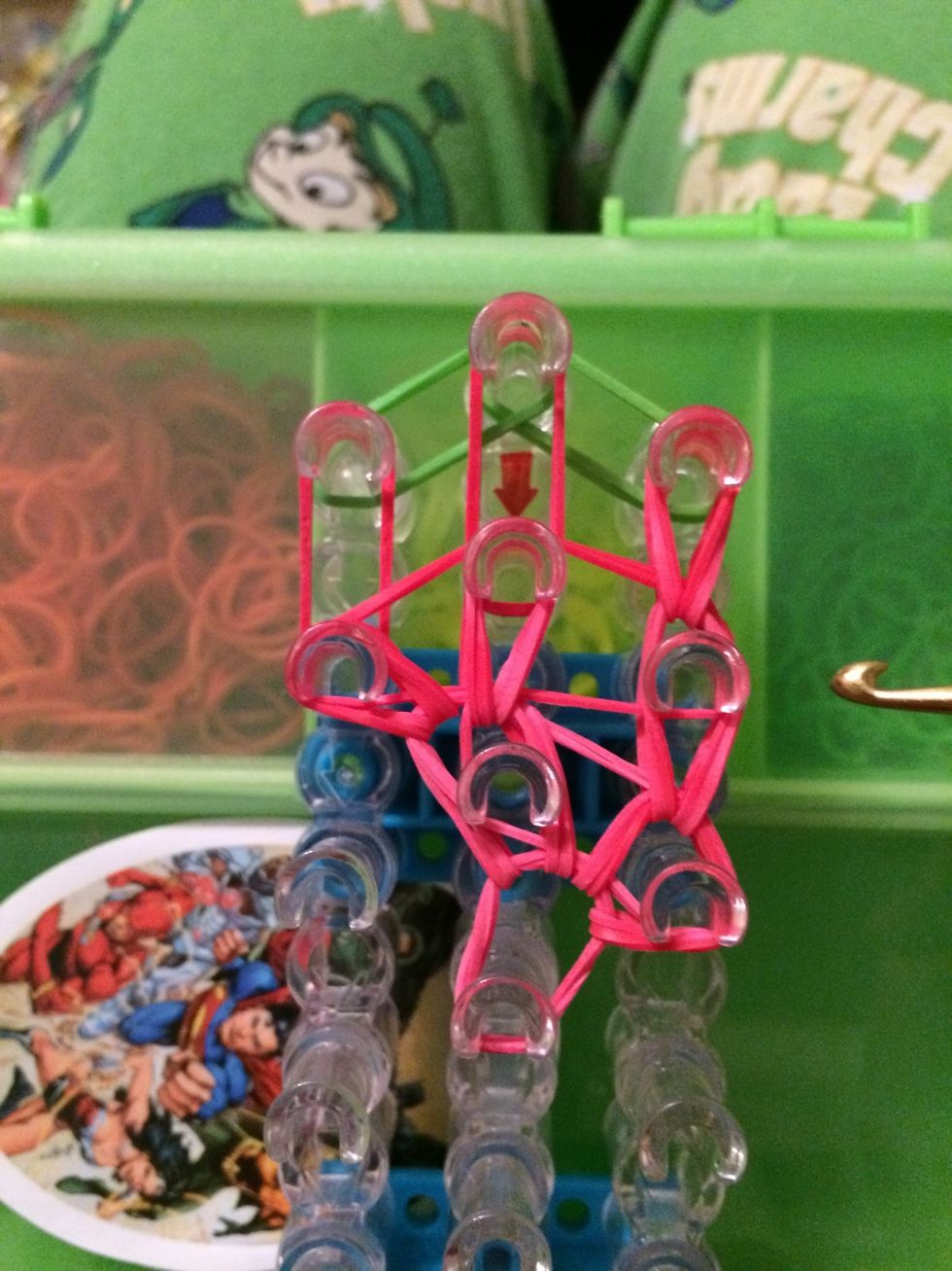 Now we are going to be placing the capping bands. Take 2 red bands and make a triangle over three pegs.