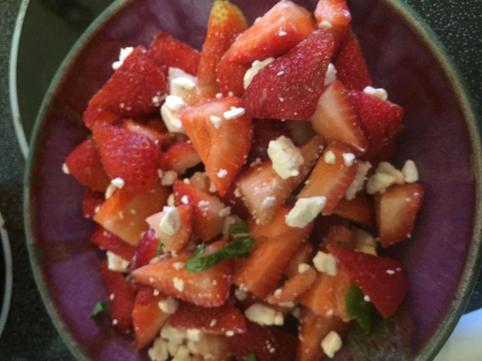Rinse strawberriesCut off green topCut in halfRinse mint leavesChop mintAdd to strawberriesAdd feta cheeseMix and eat!