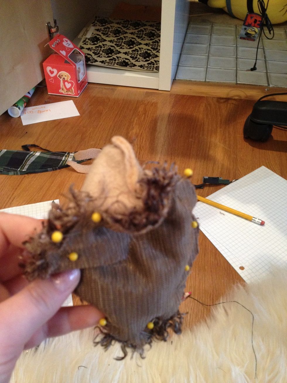 From the fabric you want for your body, cut TWO half moon shapes, about 1.5 ties the size of your head. My measurements: 6 1/4 (flat) x 3 1/4 (center)