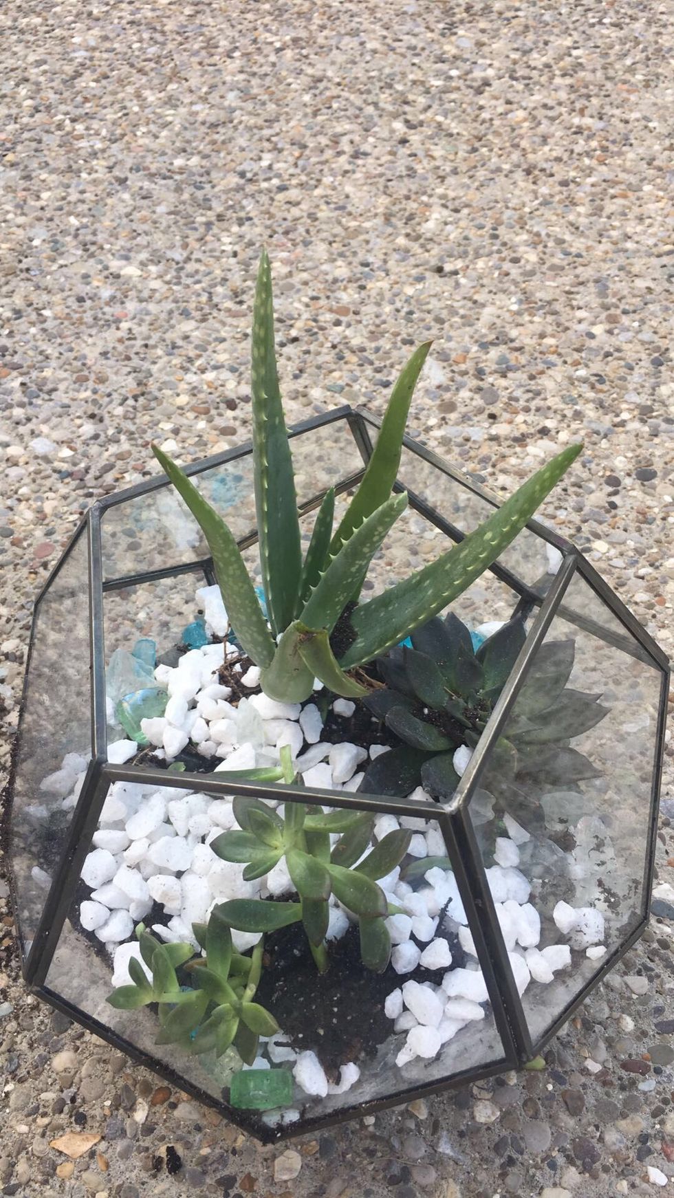 Next, space-plan for your terrarium. Place your succulents, still in their pots, next to your container. Move them around until you have a configuration that you like will fit in the glass container.
